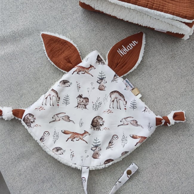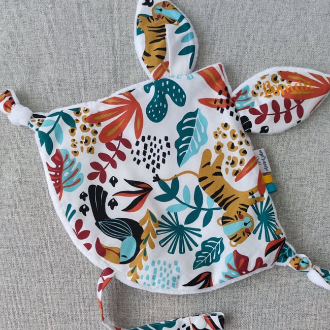 Il est composé d’une face en coton coloré que l’on définit ensemble pour créer un doudou unique, et d’une face en minkee tout doux ou en double gaze. C'est vous qui choisissez. N'oubliez pas de me précisez votre préférence dans les commentaires.